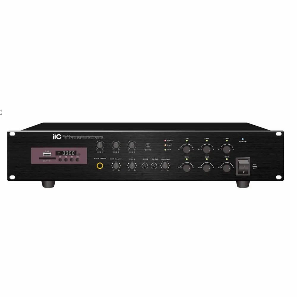 ITC TI-240Z est un amplificateur mélangeur multi-zones de 240 W RMS, conçu pour les installations audio professionnelles avec gestion de 6 zones à volume indépendant et sources MP3/USB/SD/Bluetooth intégrées.